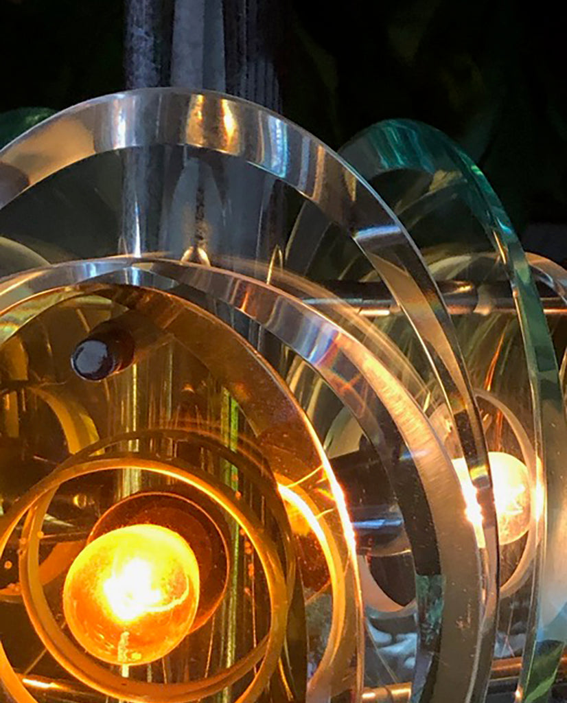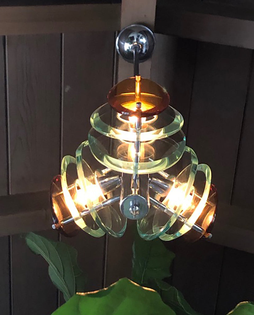of tryptic form with two progressively larger pierced oval clear crystal discs with beveled edges, the outer disc of tobacco color, centering socket, suspended from circular section structure and rod, with domed canopy