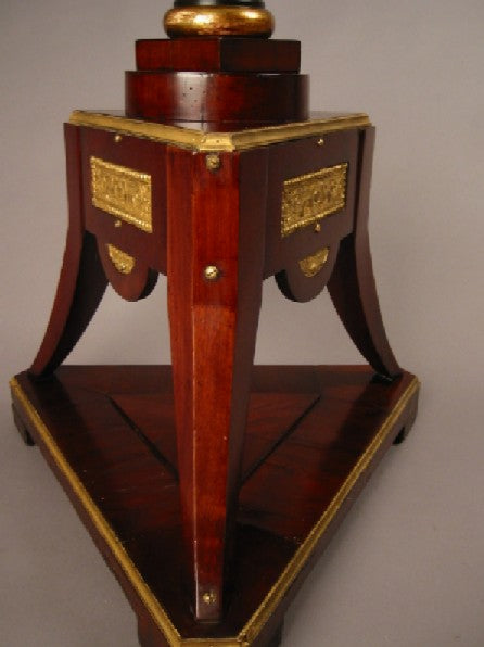 the shaft in the form of a Roman Doric column supporting later circular platform and Tazza; ona triangular tripod stand with square section saber legs; the apron with inset repoussé placque depicting winged griffins centering men on arabesque ground; the whole raised on tripod plinth with block feet; now electrified with halogen fixture