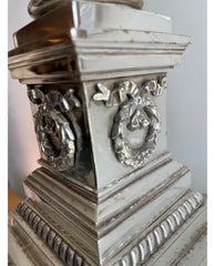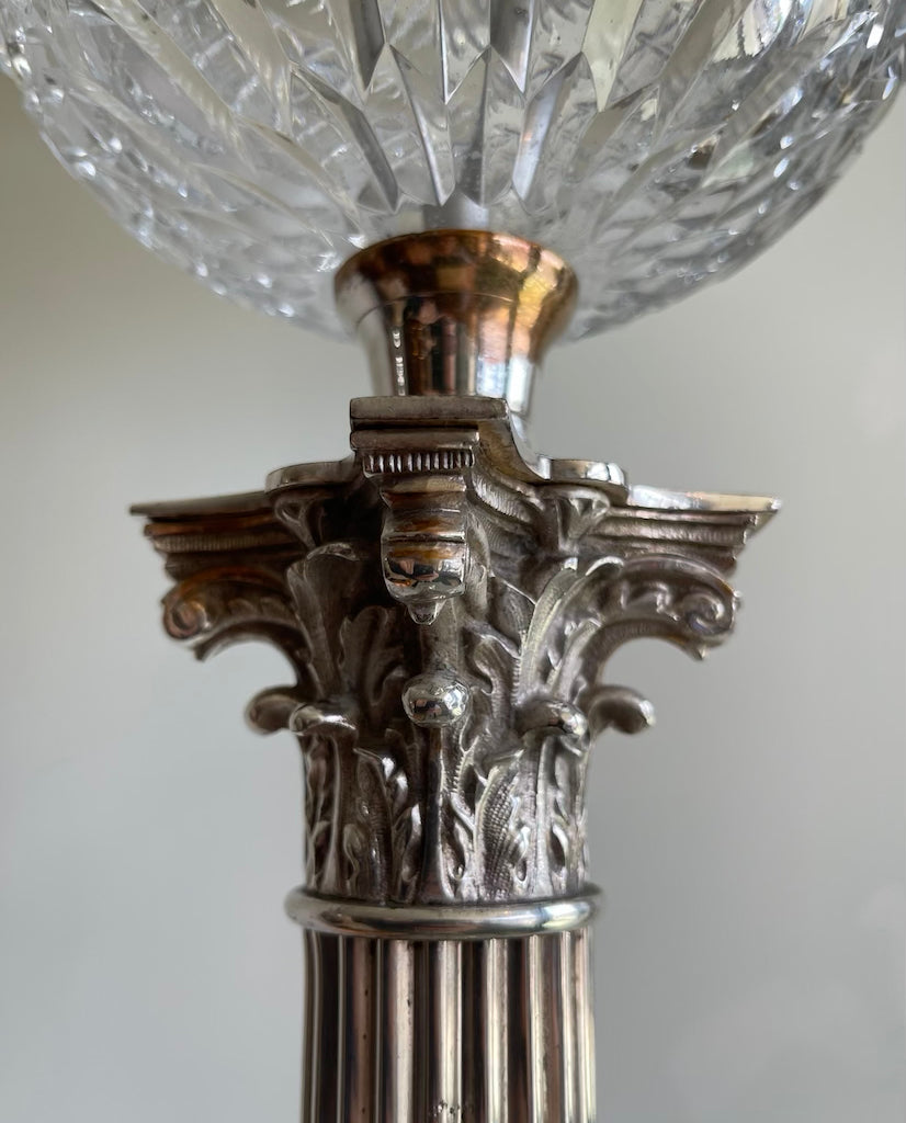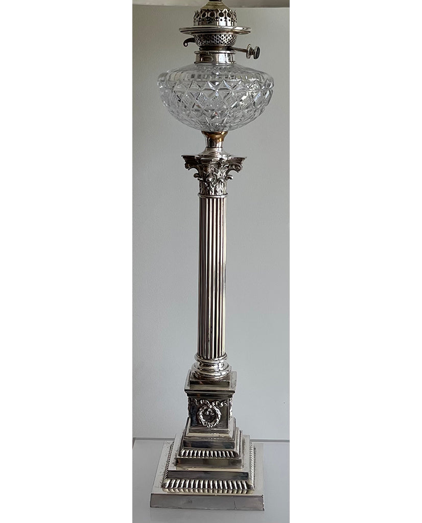 the fluted stem, surmounted by Corinthian capital and crystal reservoir, raised on square section plinth with applied laurel leave mounts on gadrooned flaring stepped base; the whole now electrified with single socket, chord switch and pleated silk shade