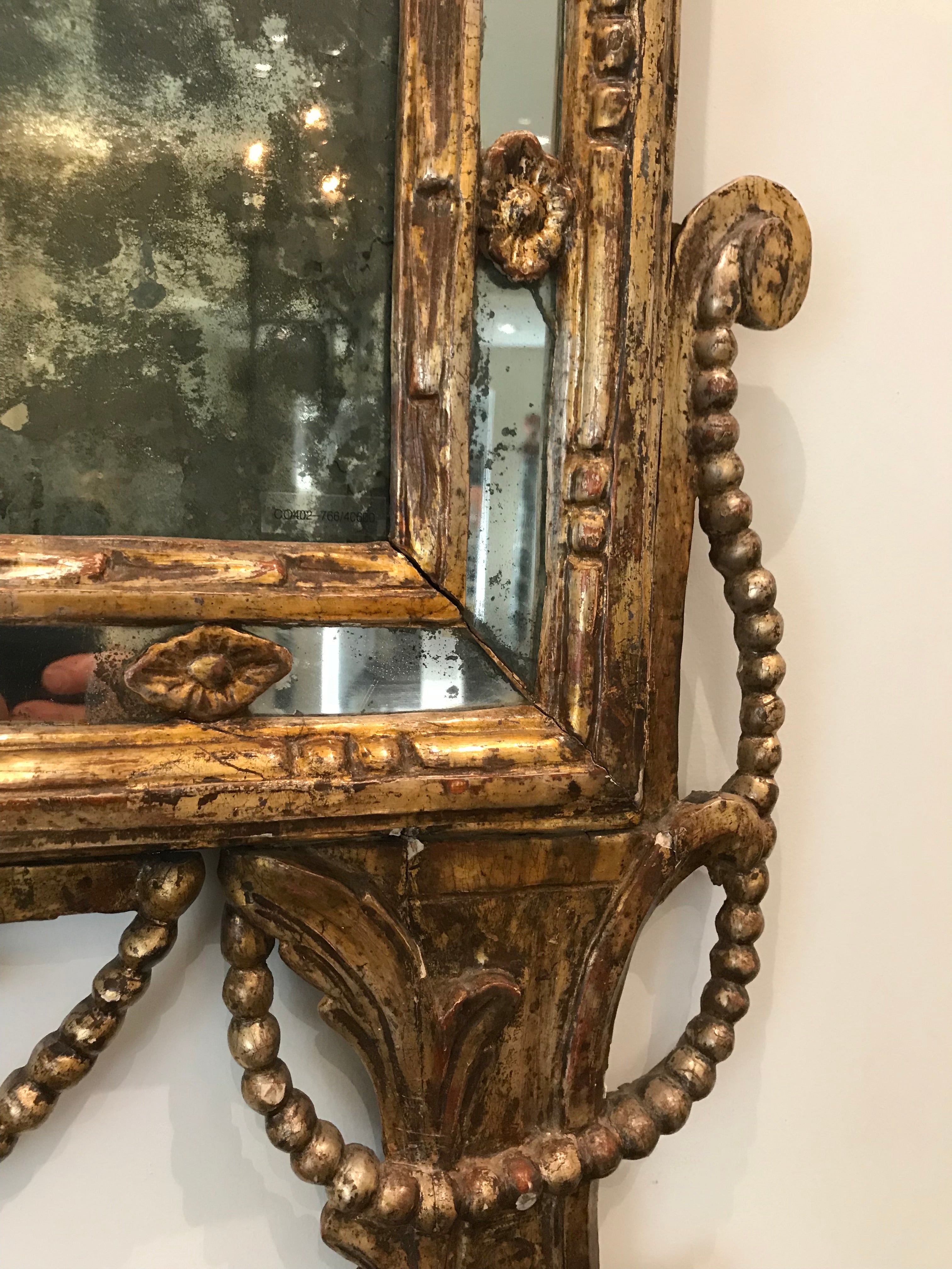 the rectangular two section mercury plate within mirrored surround with moulded frame secured by floral enrichments surmounted by pierced cresting of interlocking foliate strapwork centering classic urn and suspending bead carved festoon; the whole raised on scrolling legs with similarly carved festoon and retaining traces of original silver gilt and mica finish