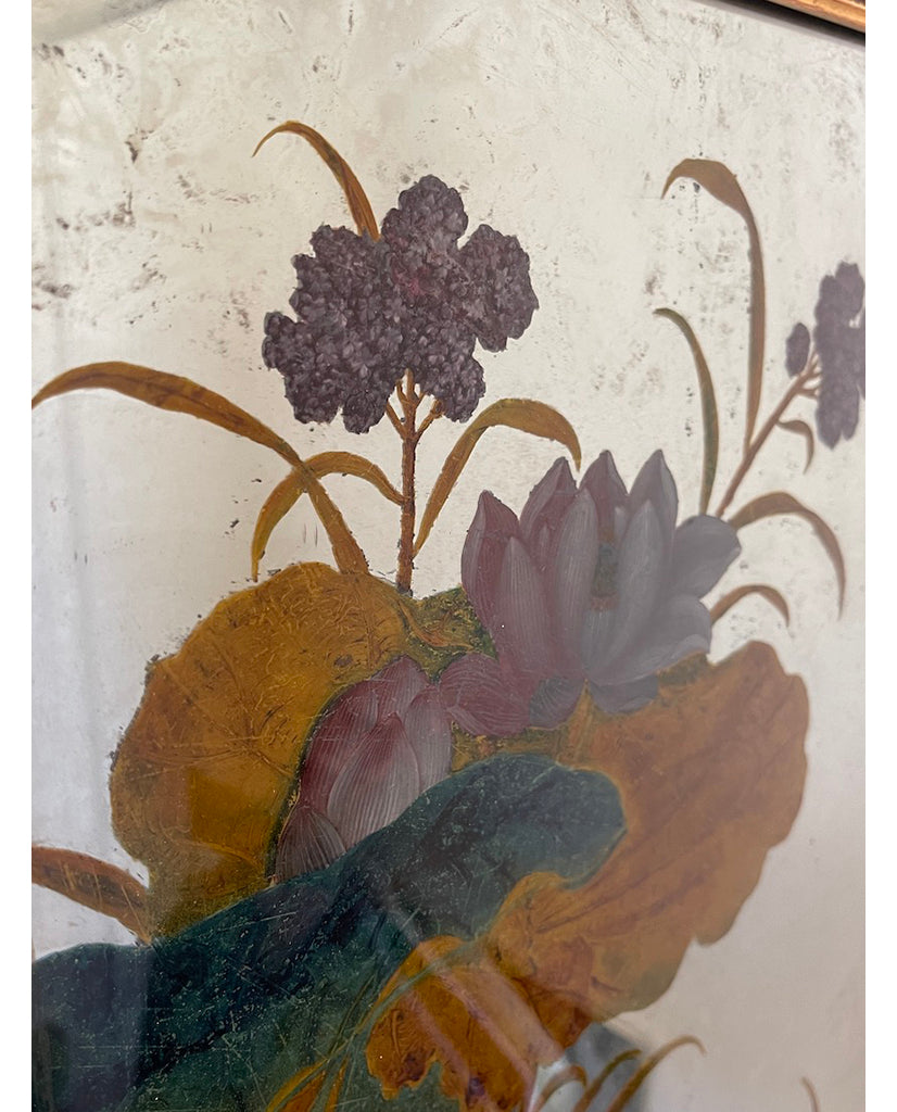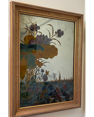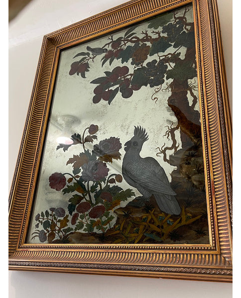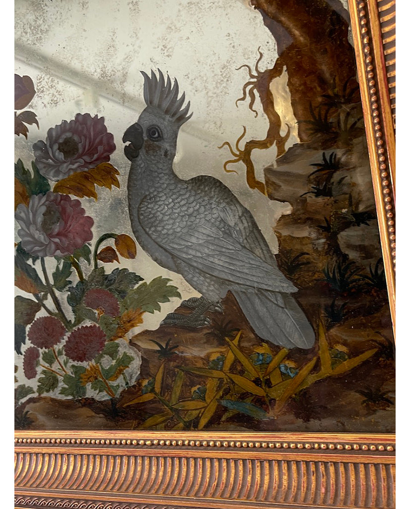 each reverse glass painted mirror depicting various birds amongst flowering and fruiting branches inset into gilt decorated frames