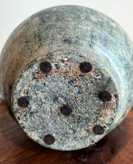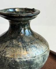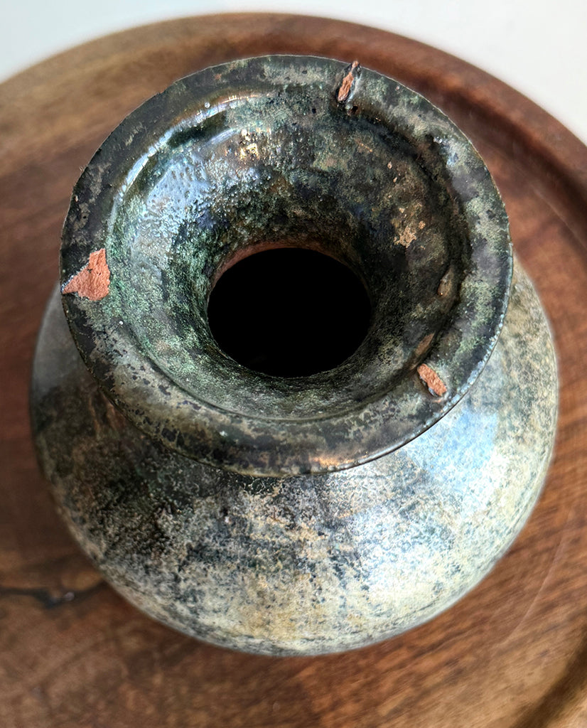 of bulbous ovoid form with concentric incised bands, rising to narrow neck and flaring to everted rim, tapering to flat bottom; the whole displaying degraded green lead glaze and traces of archological patination