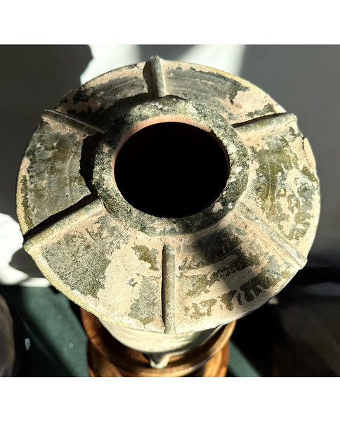 the unusually large circular section tapering body with incised concentric horizontal rings with foliate enrichment on the top band, rising to flaring contiquous downward sloping fully realized ribbed roof with oculus; the whole raised on anthropomorphic tripod feet and retaining traces of archeological patination
