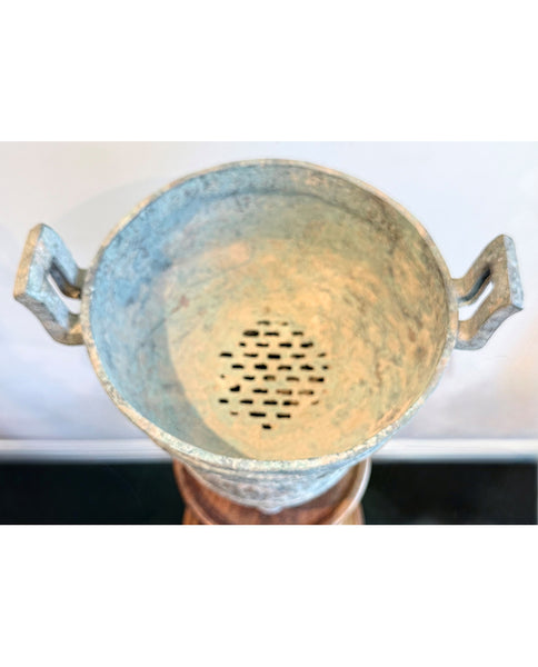 in two sections; the lower ovoid bulbous form with central raised band, contiguous with circular section tripod flaring feet, rising to narrow flat rim; the upper section fitting snuggly in the lower in the form of a deep ovoid dish with similar central raised band, rising to gently tapered rim fitted with square section pierced “D” ring handles and gently flared rim, tapering to narrow foot with pierced fret interior; the whole enriched with inlaid bands of animated warriors in silver, the lower section with Chinese characters on the rim, now displaying degraded bronze verdigris archeological patination