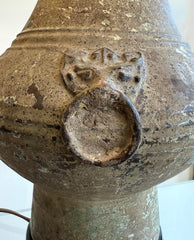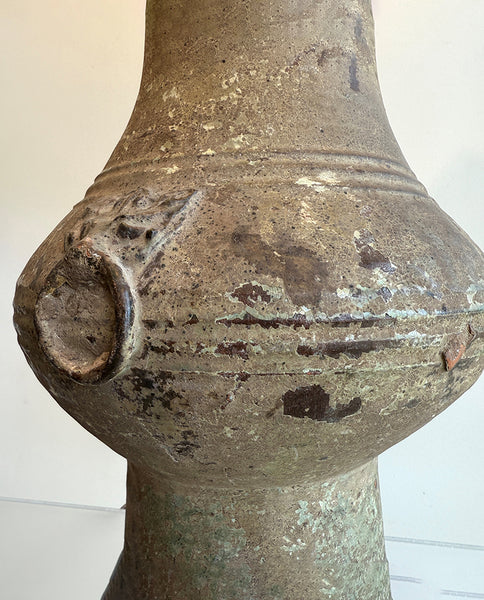 of ovoid bulbous form with concentric relief bands at the center and shoulders, fitted with relief molded and shaped dragon head drop ring handles, tapering at the neck and flaring to a relief wide banded rim and flat top, tapering sharply at the base to a gently flared flat bottom; the whole now drilled and wired with single socket, raised on hardwood compound moulded lotus base and fitted with octagon tapering parchment shade, retaining traces of archeological patination