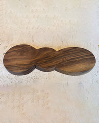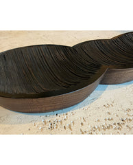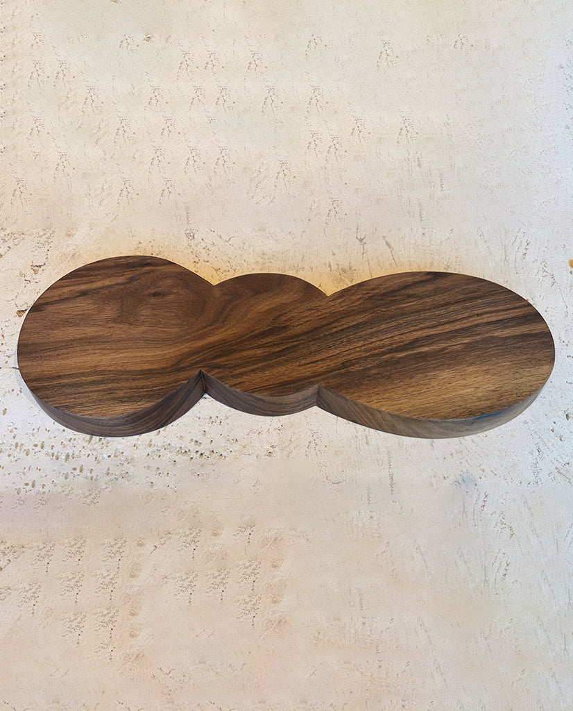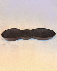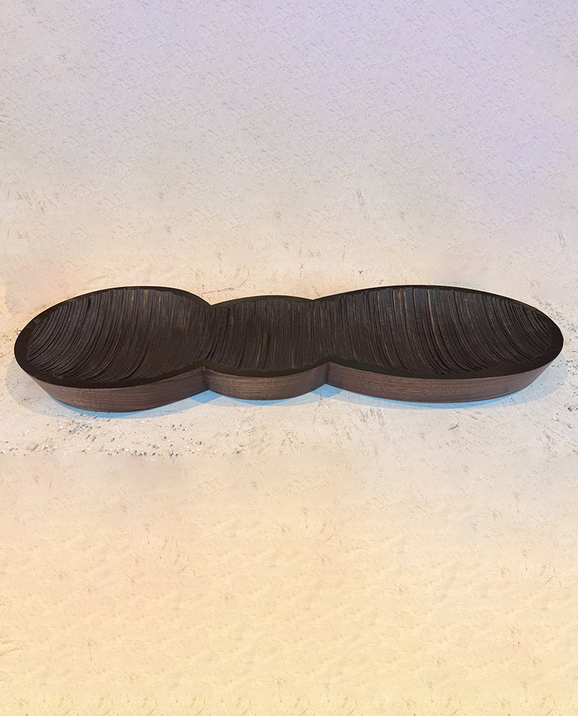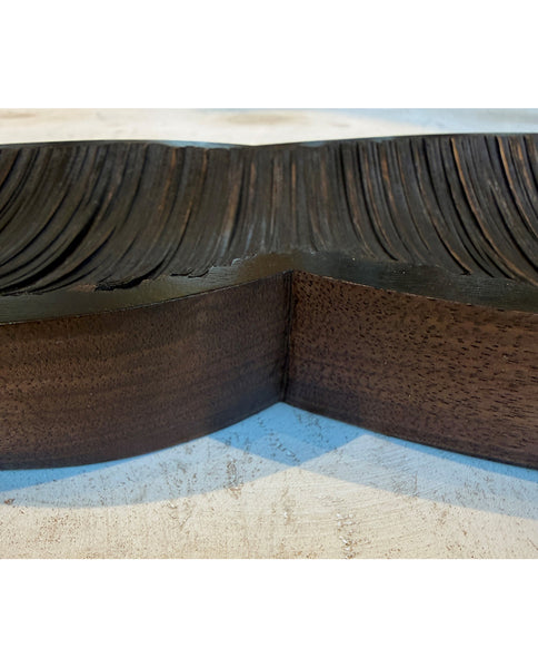 of irregular oval tryptic form in old growth walnut, with irregularly etched surface