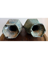 each of vasiform hexagonal shape, tapering at the neck with applied dragon head loose drop ring handles, flaring to flat rim and raised on tapering base with flat foot; the whole enriched with incised lewen reserves with cicada wings at the neck and retaining archeological bronze verdigris patination