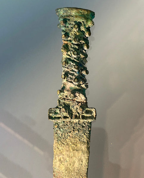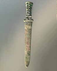 the short double edged thin rectangular tapering blade, flaring hilt deeply incised with toatie mask, the pommel with high relief beeded and ribbed decoration; the whole with bronze verdi - gris arcehological patination - restorations